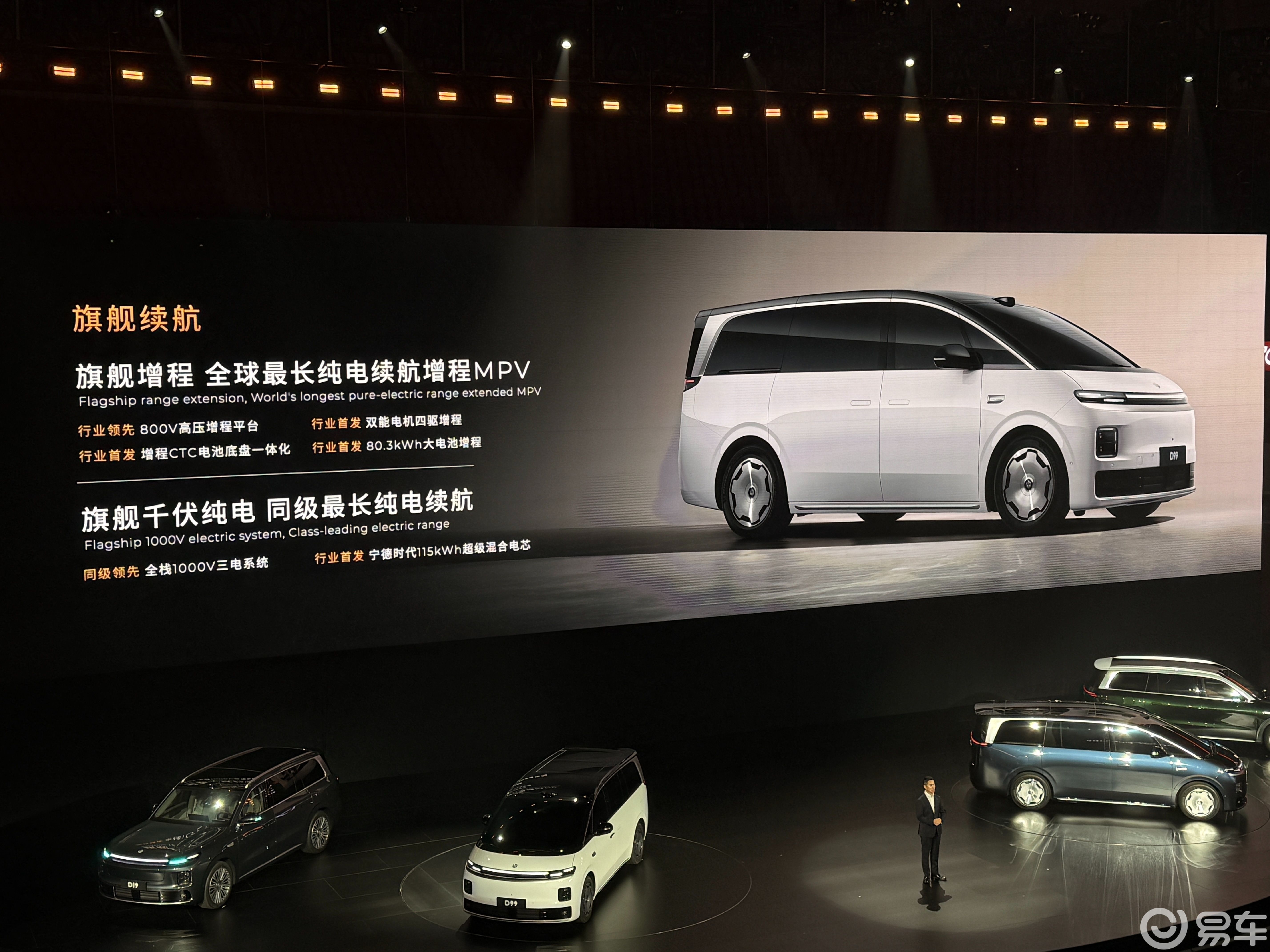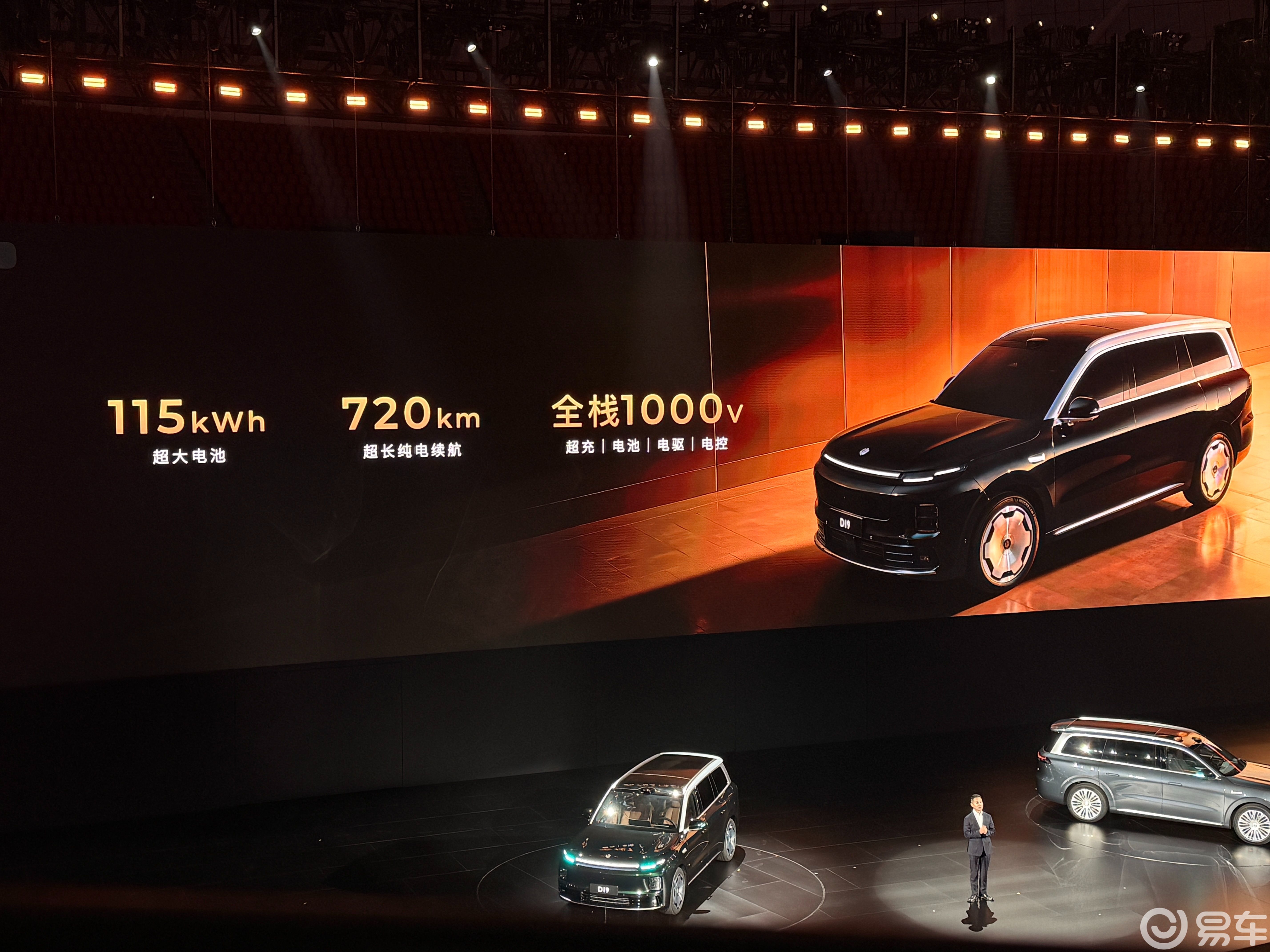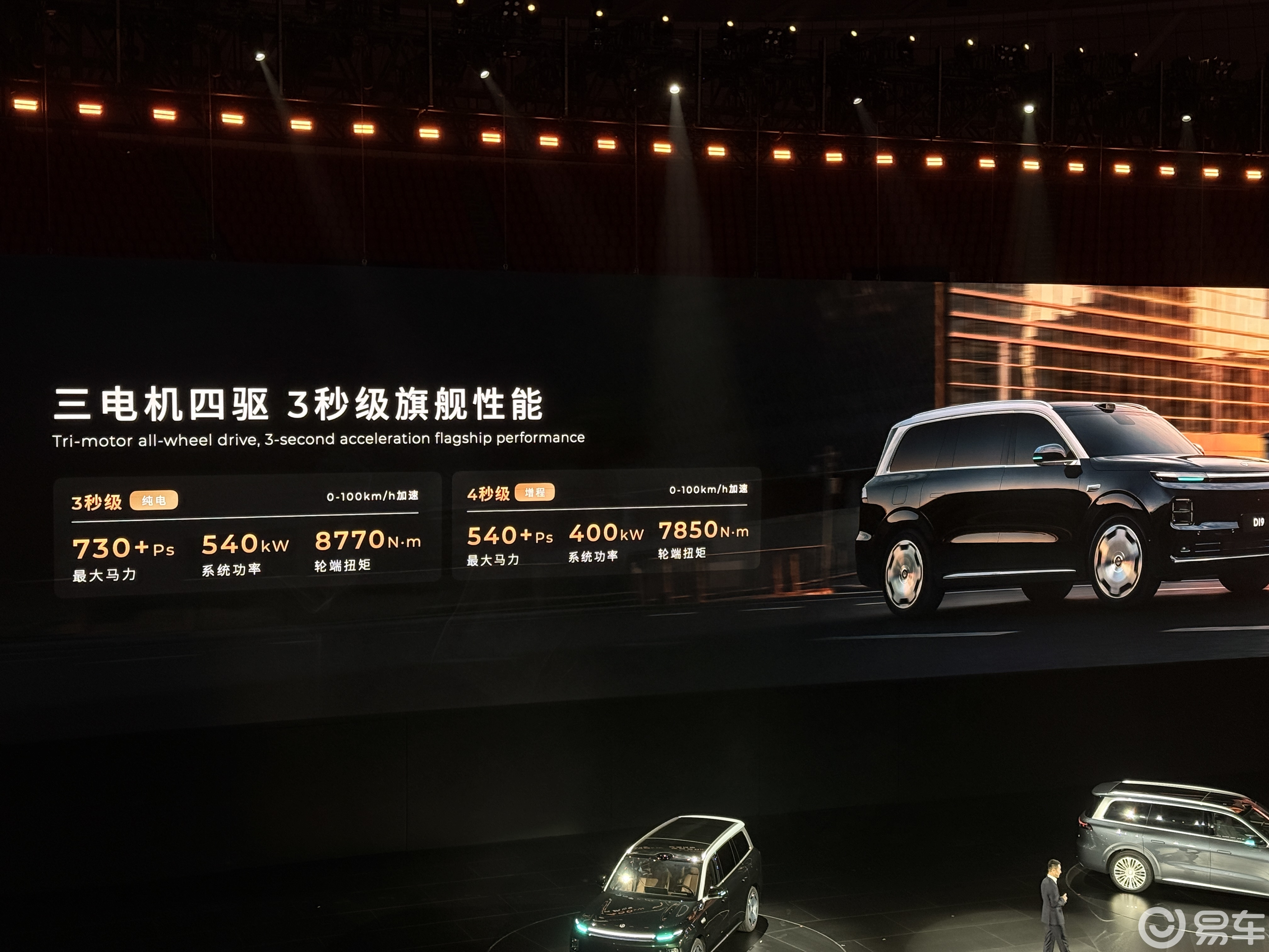 纯电版车型使用的电池包容量为115kWh,CLTC纯电续航达到了720km,配合全域千伏高压架构,峰值快充功率超过460kW,充电15分钟补能超350km。纯电版车型采用了前后三电机四驱系统,综合功率达到了540kW,官方0-100km/h加速时间达到了3秒级。