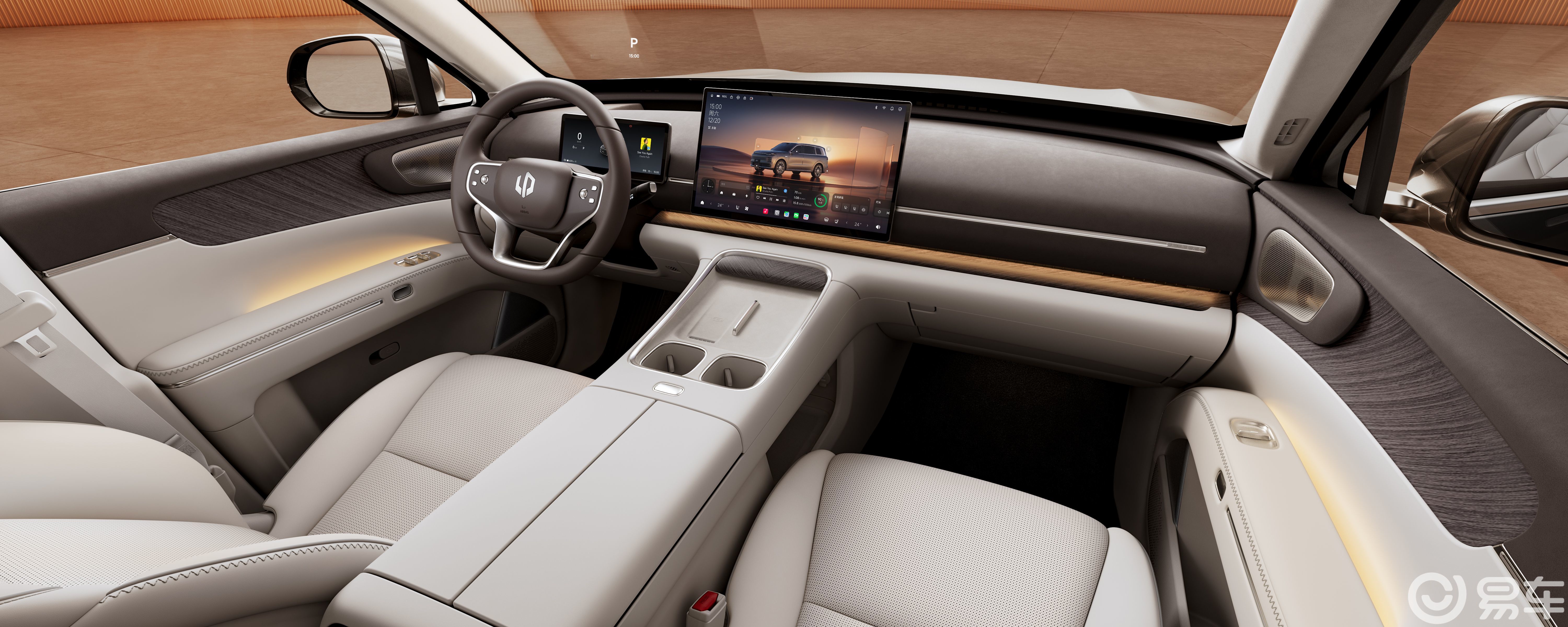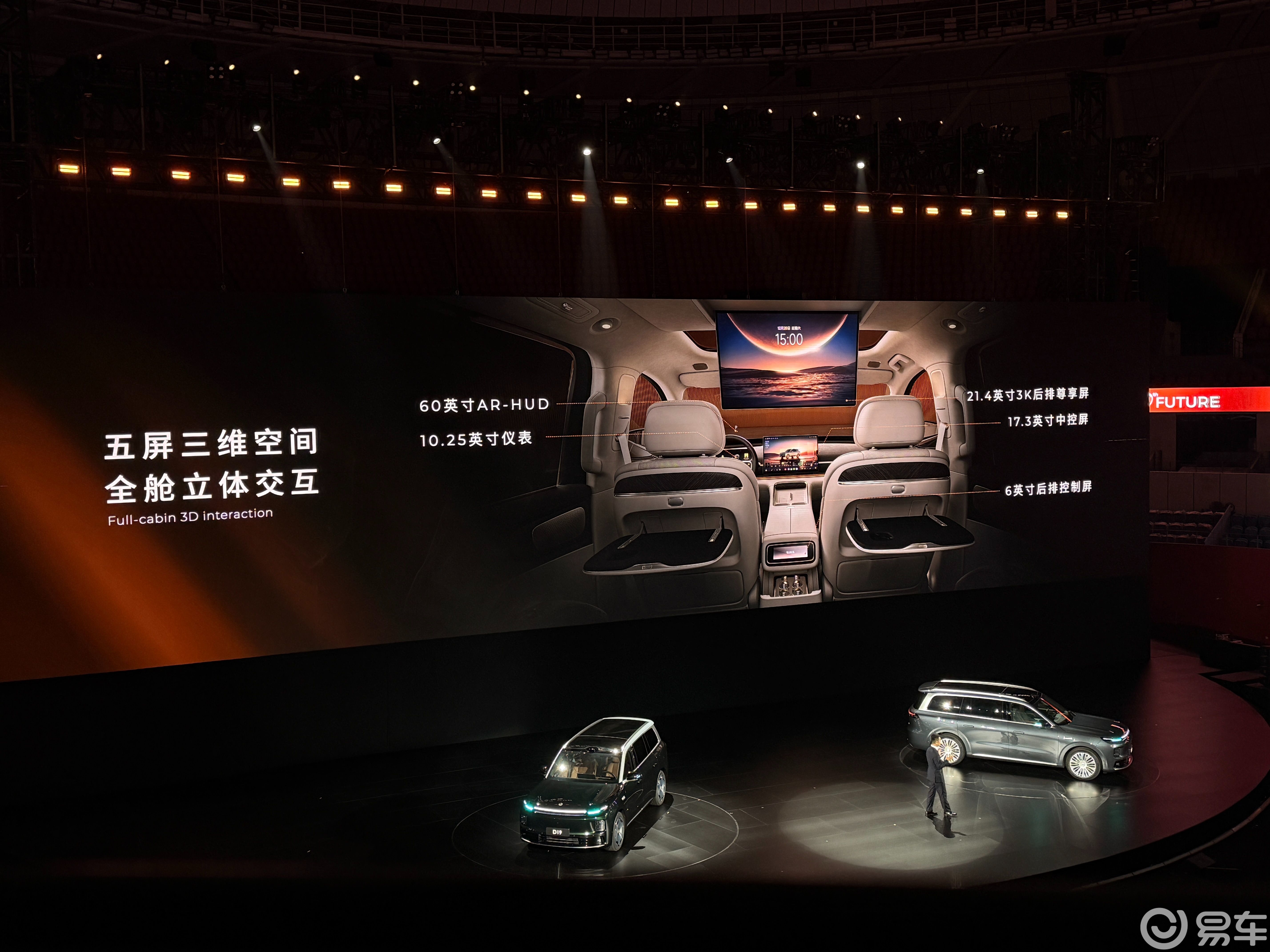 车内多屏联动,包括60英寸的AR-HUD、10.25英寸仪表屏、17.3英寸中控屏,后排配备有21.4英寸3K娱乐屏和6英寸的后排控制屏,零跑D19搭载LEAP4.0中央域控架构和双高通8797舱驾一体芯片,算力达到了1280TOPS,支持端侧AI大模型和五屏三维空间立体交互。