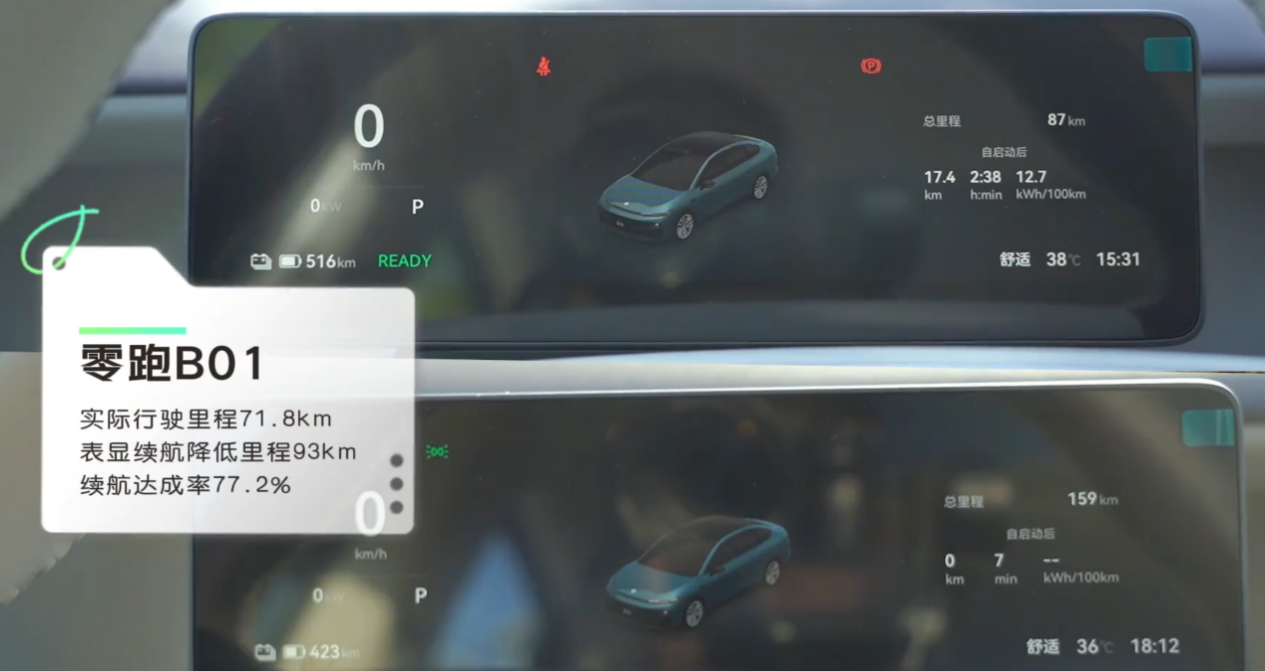 当然此次媒体还测评了两款车的续航达成率,两款车一前一后,都是单人单车,空调也开到最大,从满电到电量清零,经过了城区、城市高架快速路、高速和山路,最后,零跑B01的续航达成率为77.2%,而比亚迪秦L EV的续航达成率达到了73.2%。