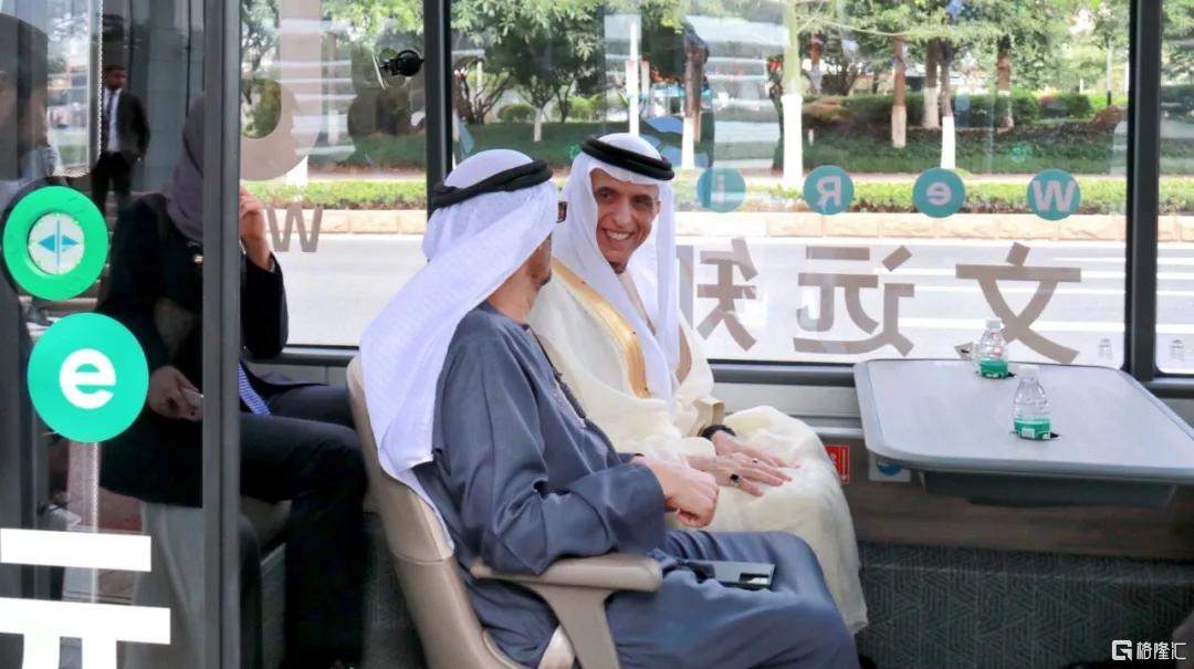 阿联酋联邦最高委员会成员、哈伊马角酋长His Highness Sheikh Saud bin Saqr Al Qasimi、中国驻阿联酋大使张益明以及哈伊马角交通局RAKTA局长埃斯梅尔・哈桑・阿尔布鲁希试乘文远小巴