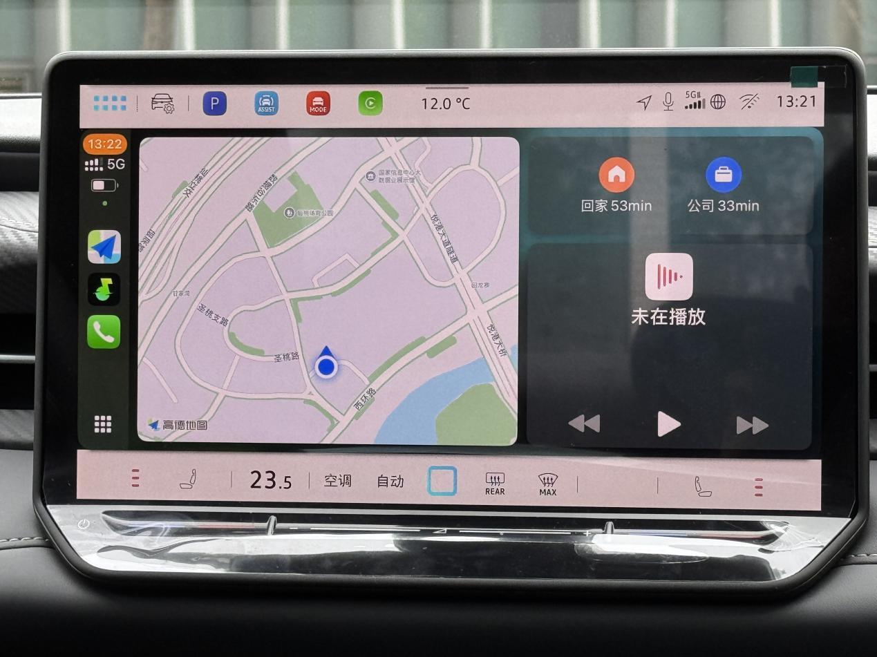 第三个比较直观的提升在于智能车机。采用了12.9英寸的中控屏幕,显示面积大了,能够显示更多的信息,配合内置的骁龙8155芯片和5G网络,当前主流的导航、音乐和娱乐软件都支持。但是,系统界面的简洁程度和整体的好用程度方面,还是跟目前主流的国产车机有一定的差距。好在它还提供了当前主流手机的智能互联功能,尤其是苹果的CarPlay,对于我这个苹果手机用户来说,这块12.9英寸的屏幕所显示的苹果系统界面清晰度很高,使用体验很好。