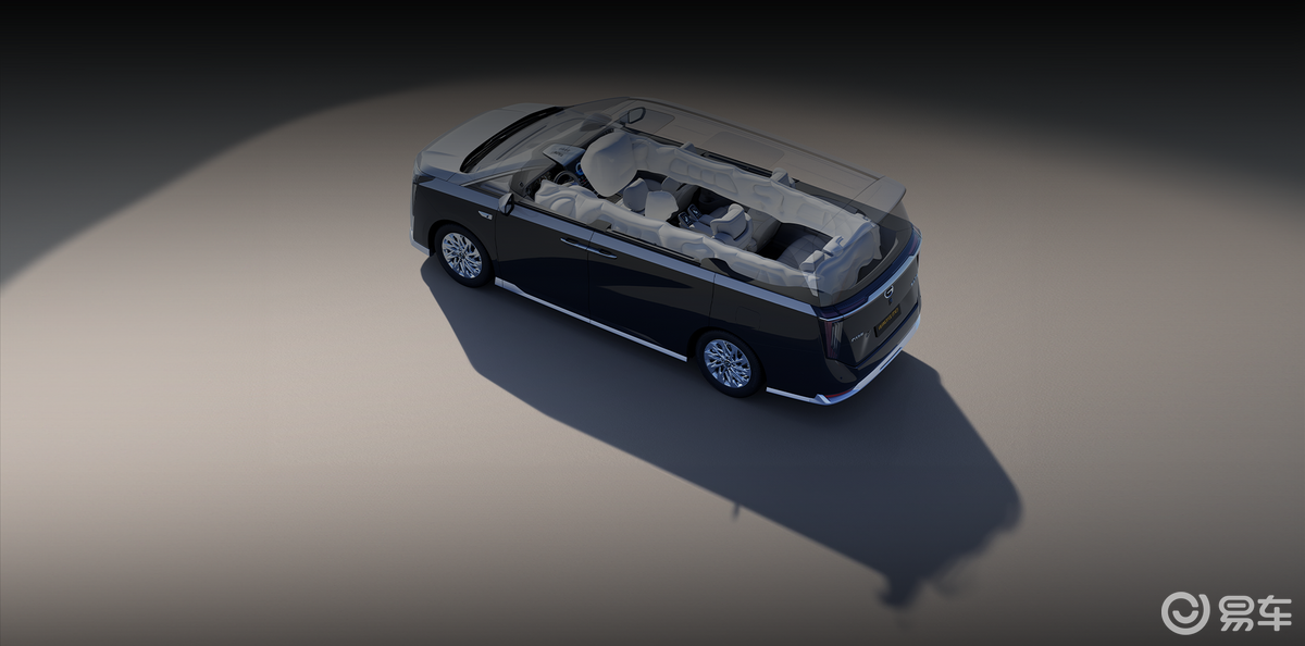 被动安全方面,采用“八纵十九横”车体结构,高强度钢占比高达85.6%,打造坚实的笼式铠甲车体。针对MPV第三排安全痛点,首创1.5米后风窗气囊,与两侧6.4米超长侧气帘,形成360°环抱式气囊矩阵,构筑刚柔并济的全向安全堡垒。