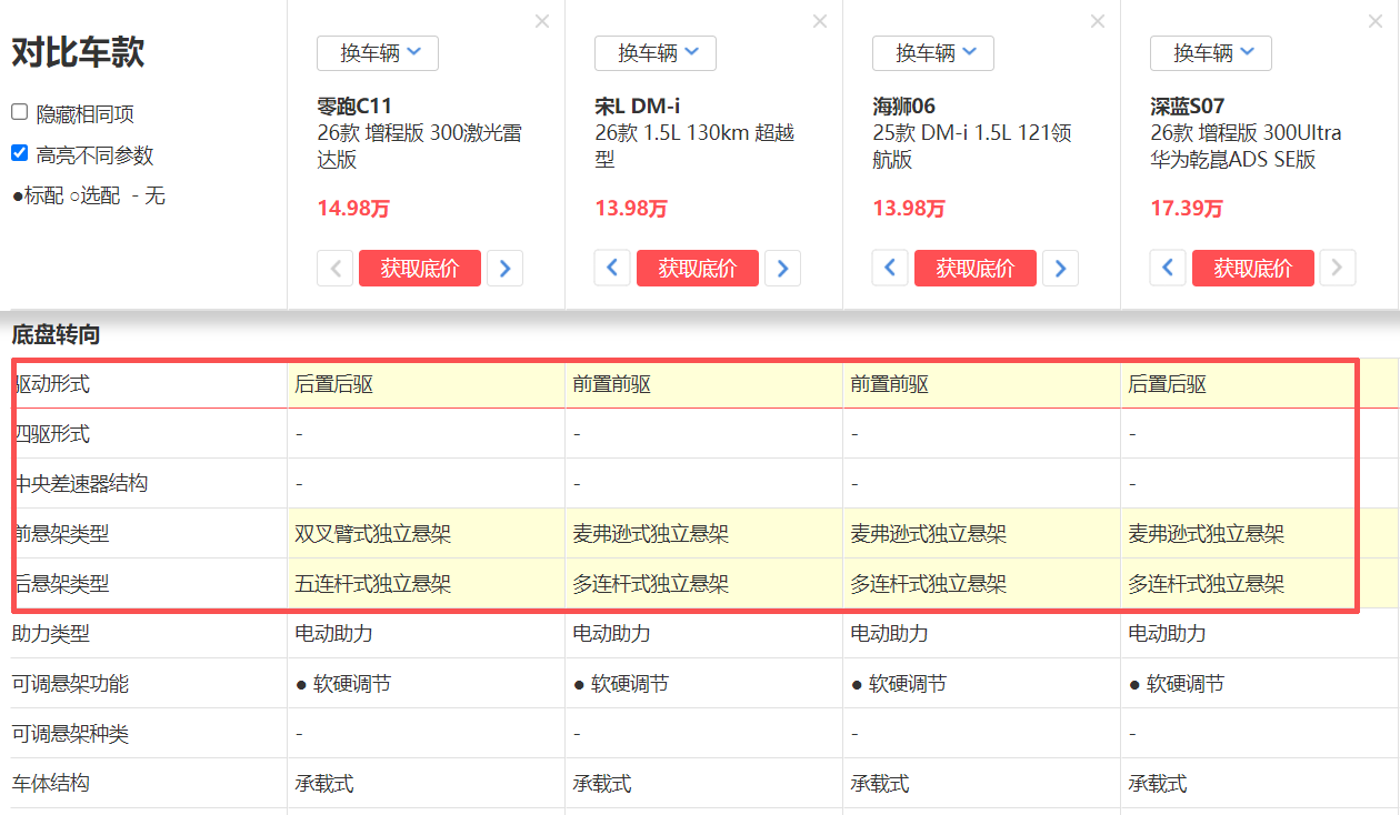 你说辅助驾驶这类配置可以通过后天加装来实现,就像笨学生靠补习一样,那底盘这样的大件不够顶又该咋办呢?比亚迪是油转电而来,但和长安深蓝一样都是根深蒂固的大厂,调校经验上的优势可以弥补宋L DM、海狮06DM、深蓝S07用前麦弗逊悬挂相比零跑C11那前双叉臂悬挂的硬件短板,但零跑C11还全系标配标配FSD可变阻尼减振器和自研LMC运动融合控制系统,这种技术上的差异想必就难以光靠调校得分来补救了吧。