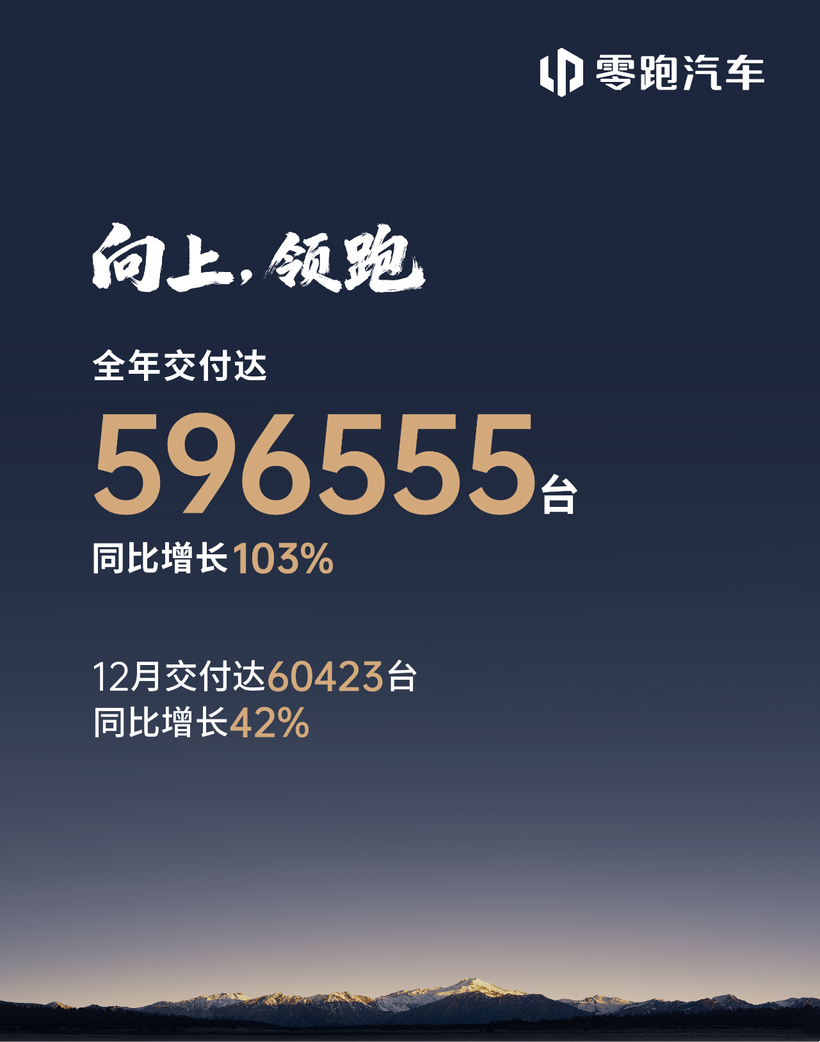 - 零跑汽车总交付量达596555台,以119.32%的完成率轻松超越50万辆年度目标,在一众新势力中它也是“领跑”的。