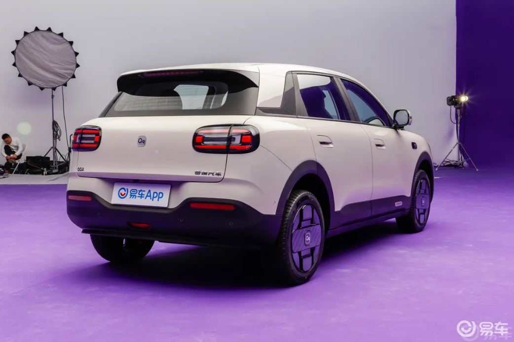 车尾部分,奇瑞QQ3EV的造型与前脸形成呼应,车顶配备有小尺寸扰流板和高位刹车灯,尾灯组也采用了熏黑处理,内部灯源点亮后也很有辨识度。此外,新车还配备了立体感很强的后包围,同样加入黑色饰板点缀,带来一些运动气息。