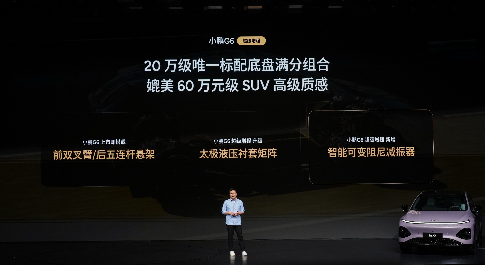 小鹏G6超级增程在驾控与安全方面同样不遗余力。新车全系标配“太极AI底盘”,拥有同级唯一的前双叉臂/后五连杆独立悬架、太极液压衬套矩阵及智能可变阻尼减振器组合,带来了媲美60万级SUV的高级质感与舒适体验。其5项AI底盘能力具备感知广、执行快、可迭代的优势,能提前识别路况并调节,轻松应对各种复杂场景。