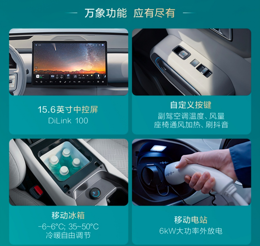内饰配置上同样堆料十足。除了常规的8.8英寸全液晶仪表+15.6英寸中控屏外,钛3闪充版配备了支持冷暖双温的车载冰箱(制冷-6℃至6℃,制热35℃至50℃)、帝瓦雷高端音响,并下放了与大哥“钛7”同款的智慧生态。