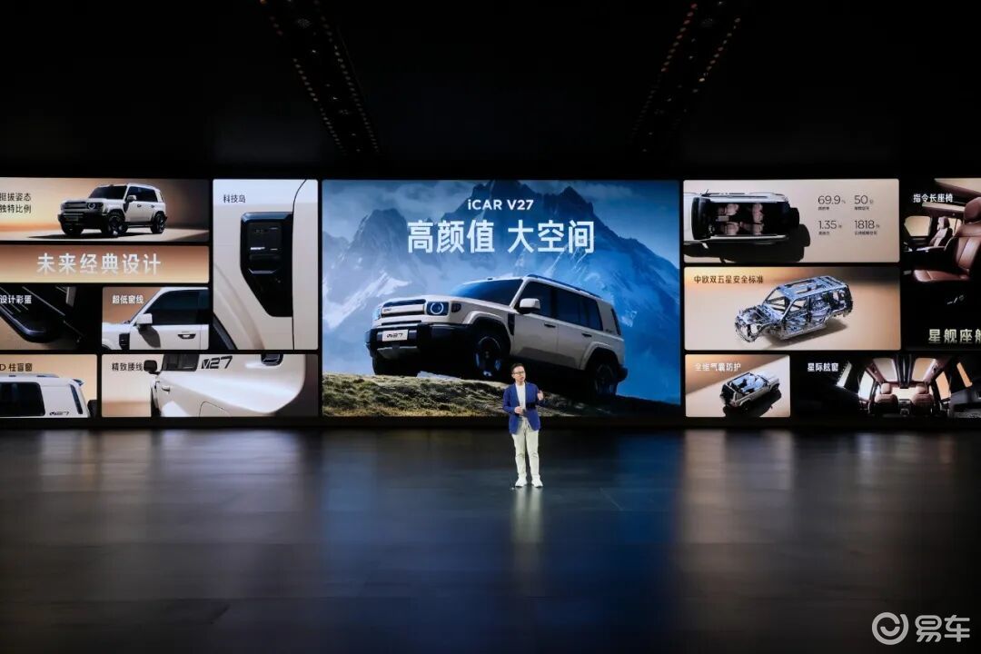 iCAR V27采用未来经典设计理念,融合经典越野姿态与精致科技,在简洁中凸显独特风格。车身长超过5米,搭配近1:1宽高比、直立A柱,姿态挺拔,勾勒硬派风格比例,超低窗线与高占比侧窗,营造通透视野。高集成度“科技岛”,在极简中透出科技精致,打造出穿越周期的经典美学。