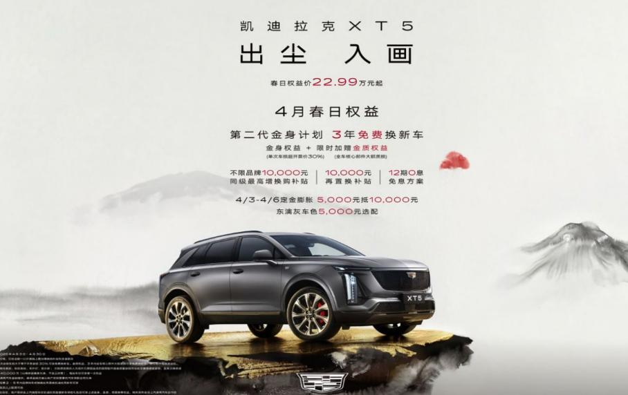 此次活动中,凯迪拉克XT5带来多重春日焕新权益:全新车色「东漓灰」正式亮相,限时选配价5000元,超跑质感触手可及;重磅升级第二代“金身计划”,在已有车损超三成免费换新的基础上限时加赠“金质权益”,三年内全车核心部件大额质损同样享受免费换新车,品质安全双重兜底。与此同时,凯迪拉克XT5推出多项春日限时福利,包括不限品牌10,000元同级最高增换购补贴、12期0息金融方案、5年内10,000元再置换补贴,叠加限时5,000元抵10,000元定金膨胀,春日限时权益价22.99万元起。
