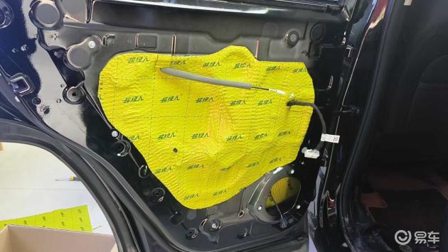 技师首先轻拆四门内饰板,分类保管螺丝和卡扣,避免刮花内饰。拆卸后,在车门钣金内侧和外侧分两层满贴超绿人2.5mm黄金甲轻量化止振板,并用滚轮反复压实,将松散的车门变成坚实的密封箱体,有效抑制钣金共振,阻断风噪传入,同时优化喇叭的发声环境。